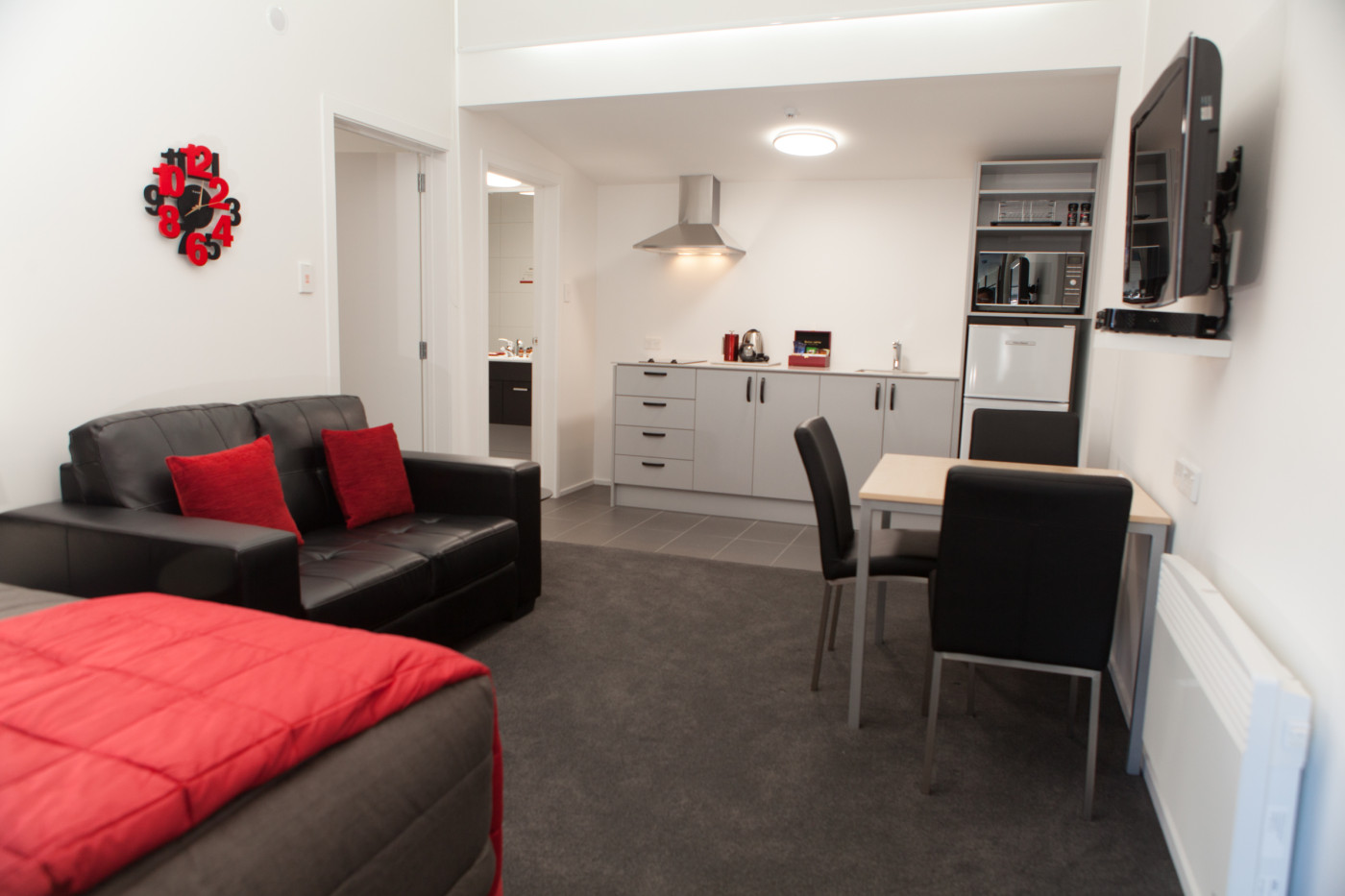 This stylish unit provides the privacy of a separate main sleeping area away from the living, dining and kitchen area. There is a superking bed in bedroom (complete with its own 28” TV), and a single in the living area if separate sleeping areas are required. Cooking facilities include 2 benchtop hobs, a combination convection-microwave oven and a fridge/freezer – perfect for those wanting to stay a while. The dining table doubles as a wonderful work space for the corporate traveller. The beautifully tiled bathroom has underfloor heating, modern glass shower, vanity, mirror and toilet. Maximum capacity – 3 people. Comfort and style.